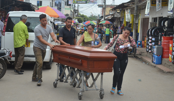 Arelis con su hijo en el ataúd por las calles de Puerto Santander. (Foto Laura Serrano)
