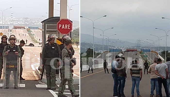 En un recorrido sobre el puente de Tienditas, el equipo de La Opinión pudo constatar que además de las vallas y contenedores han sido instalados tres cordones de seguridad con guardias nacionales con efectivos a pie y unidades motorizados, todos apertrechados con equipos antimotines, a lo largo de los tres kilómetros que corresponden al lado venezolano del puente.