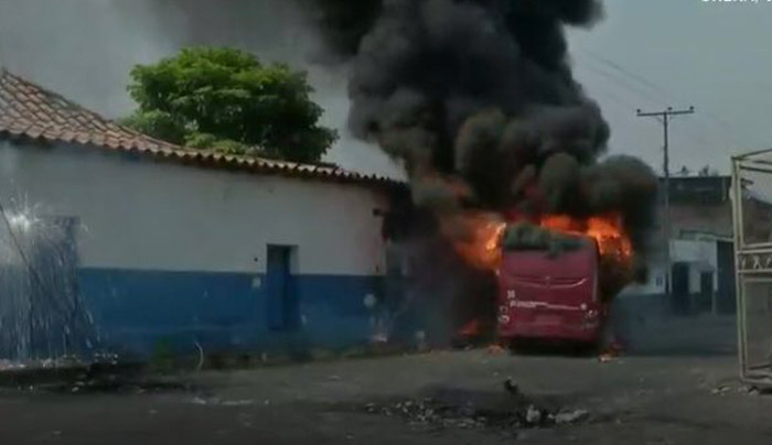 Los manifestantes quemaron un bus y se siguen aglomerando hasta que las autoridades venezolanas dejen transitar.