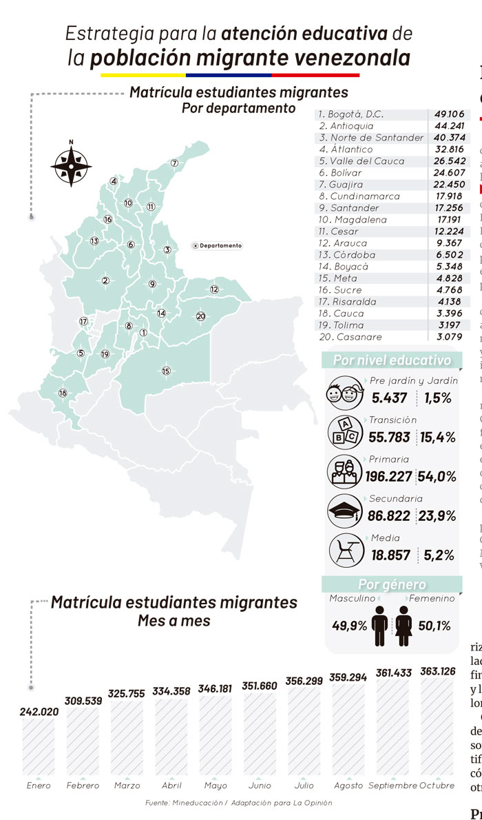 Según los datos e información presentados por el Ministerio de Educación Nacional, los estudiantes migrantes se encuentran matriculados en los 32 departamentos del país y en 1.056 de los 1.104 municipios que hay en Colombia, con una incidencia mayor en la zonas urbanas con el 82% de los alumnos y el 18% ubicado en las áreas rurales.