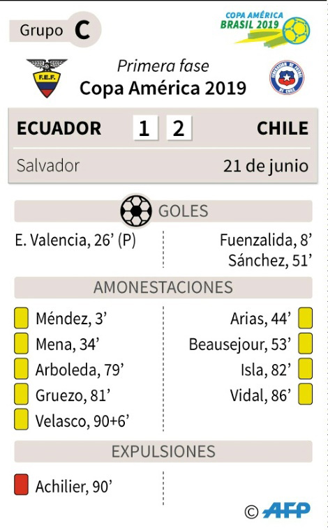 Por momentos vistoso y en otro impreciso, el bicampeón Chile firmó el libro de los cuartos de final de la Copa América de Brasil-2019 al ganar 2-1 a Ecuador este viernes en Salvador, en la segunda fecha del Grupo C.