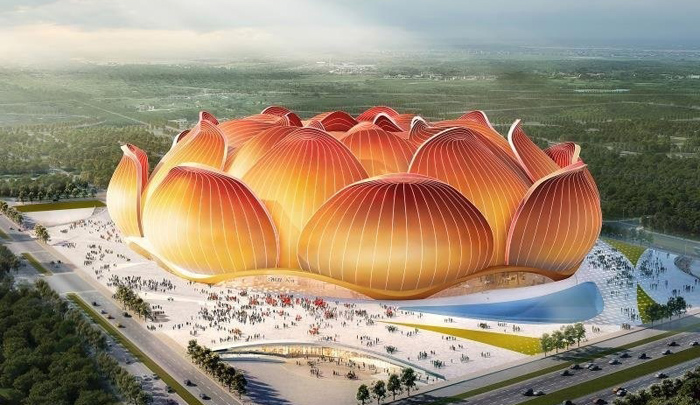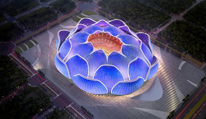 (A pesar de la pandemia que se vive por el coronavirus, China no ha parado la construcción del estadio que tendrá la forma de una flor de loto.)