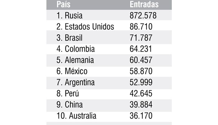 Tras Rusia (872.578 entradas), figuran Estados Unidos (86.710), Brasil (71.787) y Colombia (64.231 entradas) en la relación de países que más interés han mostrado.