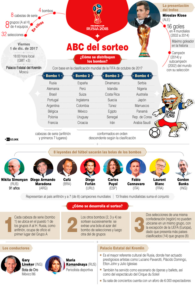 El sorteo mundialista se celebrará en el Palacio del Kremlin. El acto será presentado por el exfutbolista inglés y actual comentarista Gary Lineker y por la periodista rusa Maria Komandnaya.