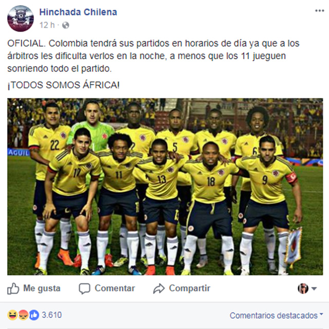 Un página de Facebook llamada 'Hincha Chilena', que cuenta con más de 170 mil seguidores y que a más de 164 mil personas les gusta, hizo una publicación racista en contra de Colombia que generó indignación de varios internautas.