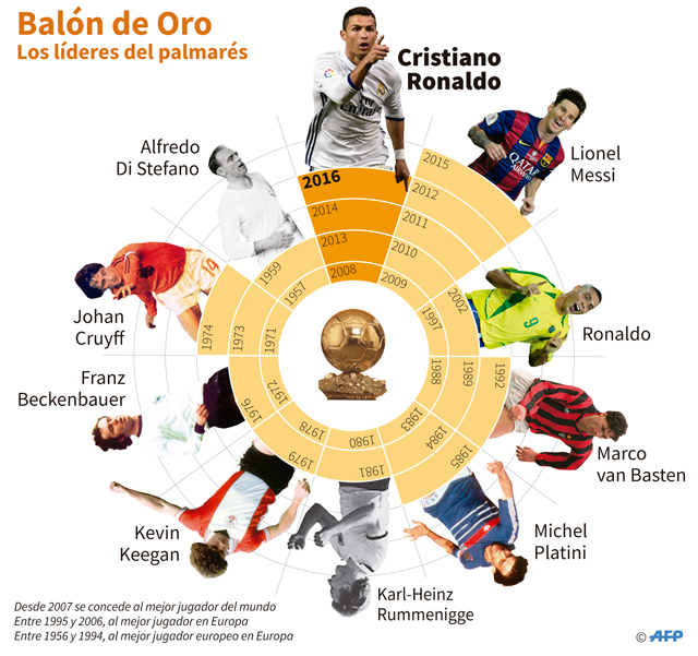 Messi, de 30 años, lo consiguió en 2009, 2010, 2011, 2012 y 2015. Por su parte, Cristiano Ronaldo, que cumplirá 33 años en febrero, lo hizo en 2008, 2013, 2014 y 2016. Ambos se han repartido el premio en la última década.