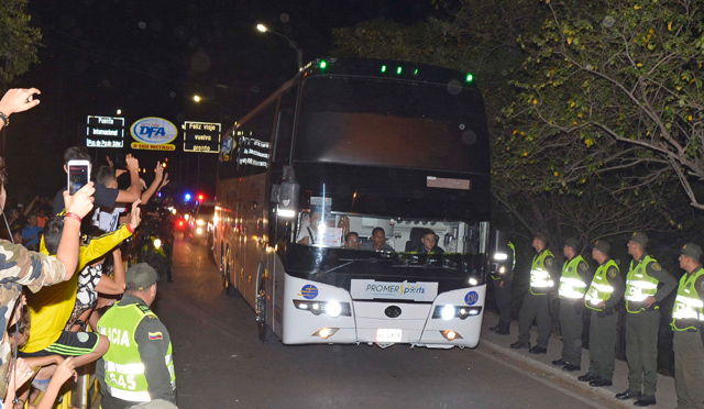 Aproximadamente a las 10:00 de la noche una caravana fuertemente custodiada por policías y agentes de tránsito ingresó a territorio colombiano, en donde se encontraba un centenar de aficionados que esperaron desde temprano el paso de la delegación cafetera.