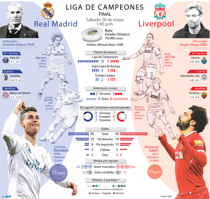 Real Madrid y Liverpool se miden hoy en Kiev (1:45 p.m. Hora de Colombia) en una final de Liga de campeones en la que el equipo español es favorito, con sus tres finales ganadas en las últimas cuatro ediciones.