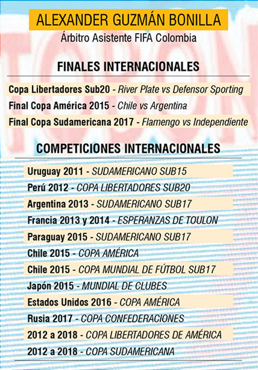Con emoción, el cucuteño Alexander Guzmán Bonilla cuenta que tras 18 años de carrera en el arbitraje colombiano, será el primer nortesantandereano en un Mundial de Fútbol. Guzmán, juez de línea, hace parte de la terna colombiana que, junto a Wilmar Roldan (central) y Cristián de la Cruz (asistente), pitará en Rusia 2018.
