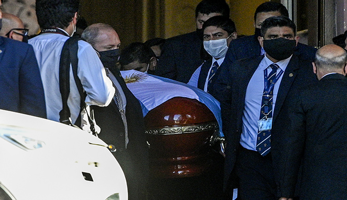 Los restos de Diego Armando Maradona son trasladados a un cementerio en la periferia, donde están sepultados sus padres, para un "entierro íntimo" este jueves, tras un velatorio caótico en la Casa Rosada (sede de Gobierno) con incidentes en varias calles de Buenos Aires.