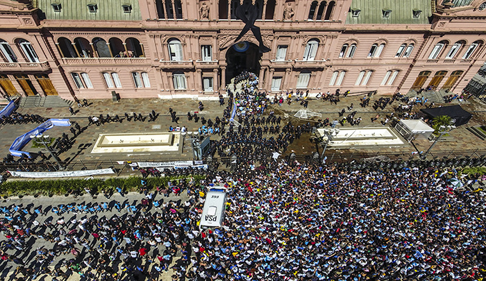 Apilados en una fila interminable que serpentea la histórica Plaza de Mayo, en Buenos Aires, decenas de miles de hinchas avanzan a paso lento con la esperanza de ingresar a la Casa Rosada (sede de Gobierno) para el velatorio donde se encuentra el féretro cubierto con la bandera Argentina y las casacas de la Albiceleste y de Boca Juniors con el número '10'.