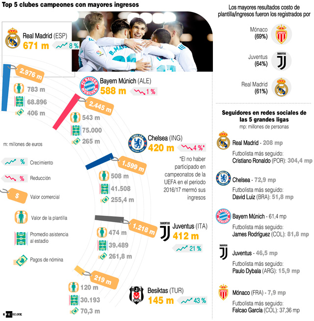 Así mismo, señala que las mayores ratios coste de plantilla/ingresos fueron las registradas por el Real Madrid (61%), Juventus (64%) y Mónaco (69%), todos ellos campeones de sus respectivas ligas y finalistas o semifinalistas en la UEFA Champions League.