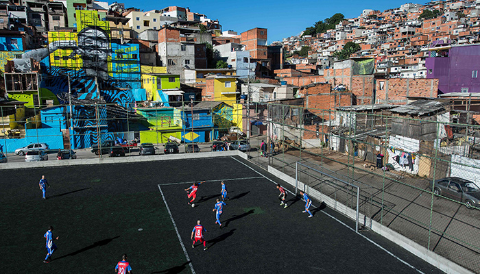 En Brasil, un país apasionado por el fútbol, hay campos entre los edificios. Es el caso en Sao Paulo, donde un inmenso retrato del delantero Gabriel Jesús pintado en las fachadas cercanas observa a los jugadores en el campo. O en el corazón de la Tavares Bastos, donde los futbolistas se disputan la victoria en medio de edificios de chapa y ladrillo.