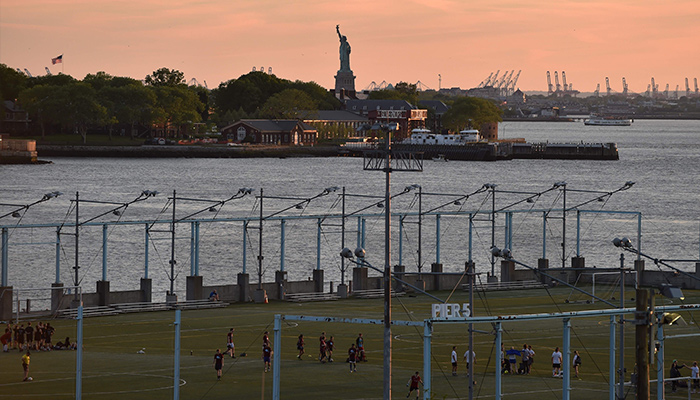 En Brooklyn (Nueva York), los partidos se juegan junto al río, con la Estatua de la Libertad de fondo.
