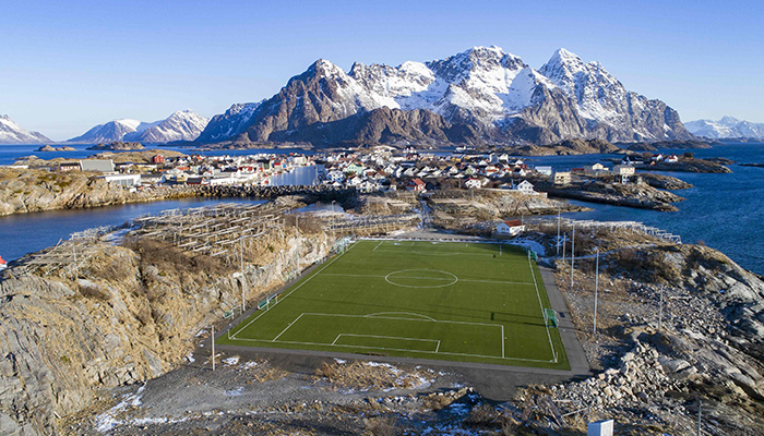 En la otra punta del planeta, en el puerto de pesca de Henningsvaer, en el archipiélago ártico de Lofoten, en el extremo norte de Noruega, el césped sintético verde contrasta con un paisaje de montañas nevadas junto al mar. En este clima el césped natural no podría sobrevivir.