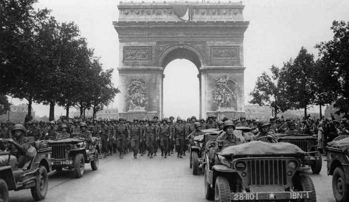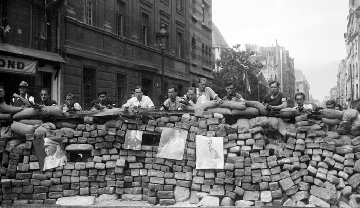 (Miembros de las Fuerzas del Interior francesas (FFI), detrás de una barricada en la que cuelgan retratos de dignatarios nazis en la calle Saint-Jacques de París.)