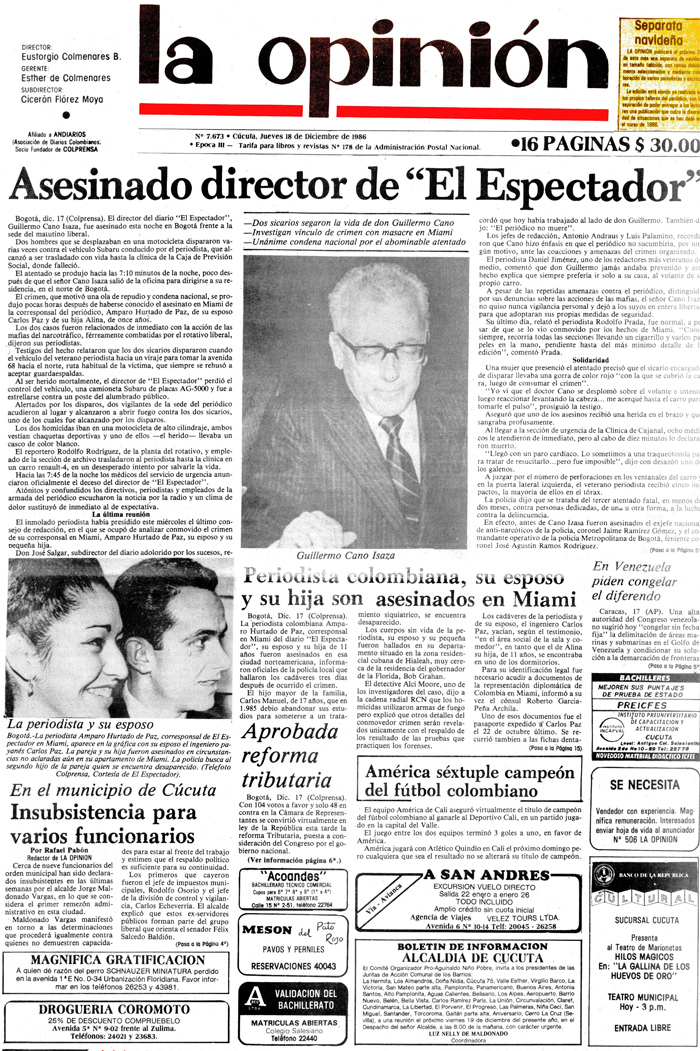 El 17 de diciembre de 1986, sicarios en moto acabaron con la vida de Guillermo Cano Isaza.