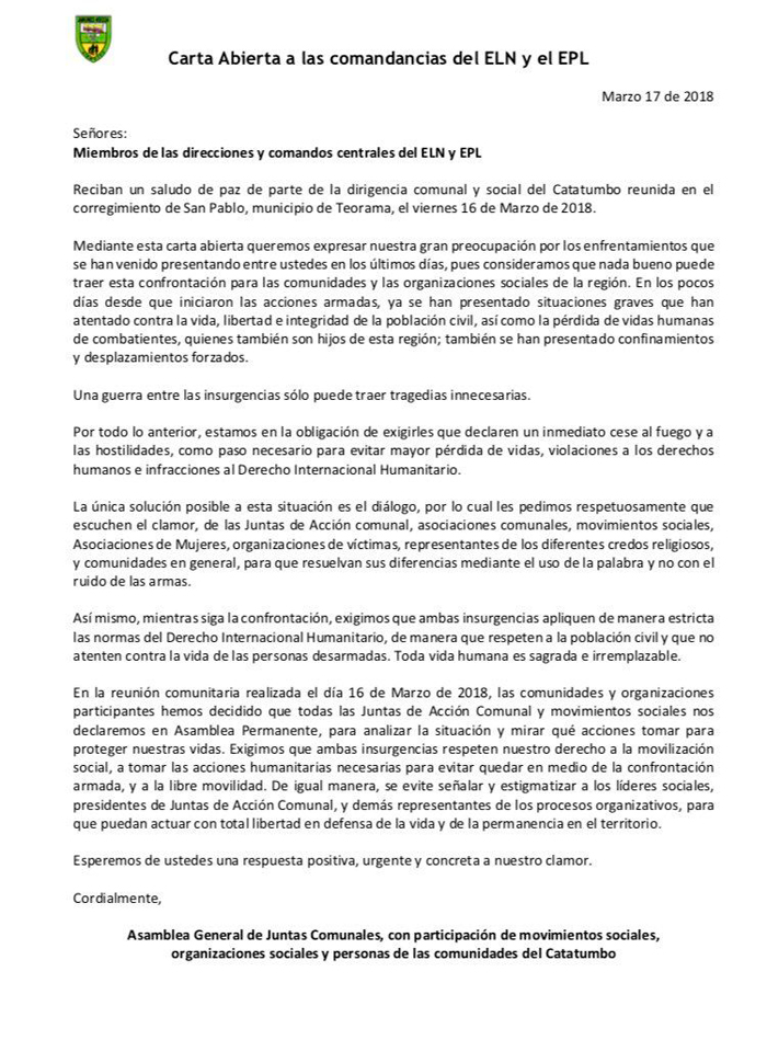 Este sábado las asociaciones comunales pidieron a los bandos que se enfrentan hacer un pare a la guerra por cuestiones humanitarias, debido a que los militantes tienen relaciones con algunas comunidades y se derrama sangre de la gente catatumbera. A continuación el comunicado que emitieron: