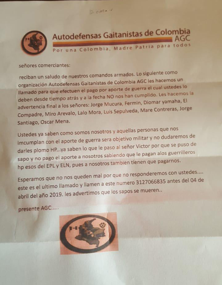 En medio de lo sucedido, se conoció un panfleto de las Autodefensas Gaitanistas de Colombia, en el que estaba escrito su nombre y el de otros comerciantes como muestra de “advertencia” para que todos cumplan con el pago del “impuesto de guerra” que es exigido por estos grupos al margen de la ley.