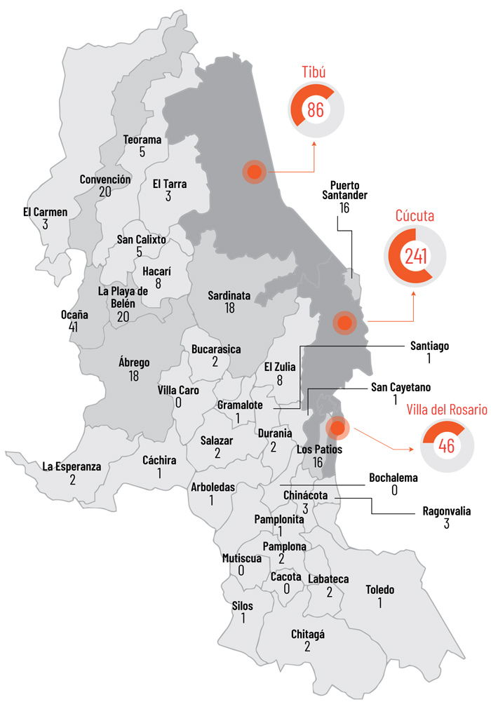 Tibú fue el segundo municipio donde más se contaron asesinatos, con un reporte de 86 casos. Sin embargo, este medio le hizo seguimiento a 94 hechos que ocurrieron en esa población del Catatumbo, donde se libra una interminable guerra (en áreas rurales) entre bandas criminales, disidencias de las Farc y guerrillas, por el control territorial, de narcotrafico y el contrabando, entre otros ilícitos.