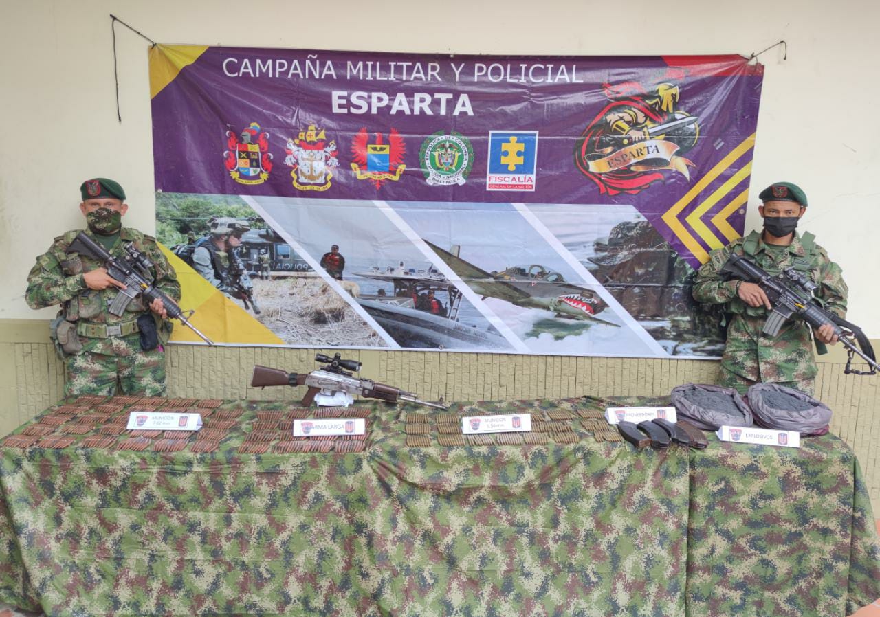 Según el Ejército, en el lugar también incautaron aproximadamente 24 kilos de explosivo tipo R1, utilizado normalmente por grupos criminales en la fabricación de artefactos explosivos improvisados y minas antipersonal, para atentar contra la población civil y las tropas.