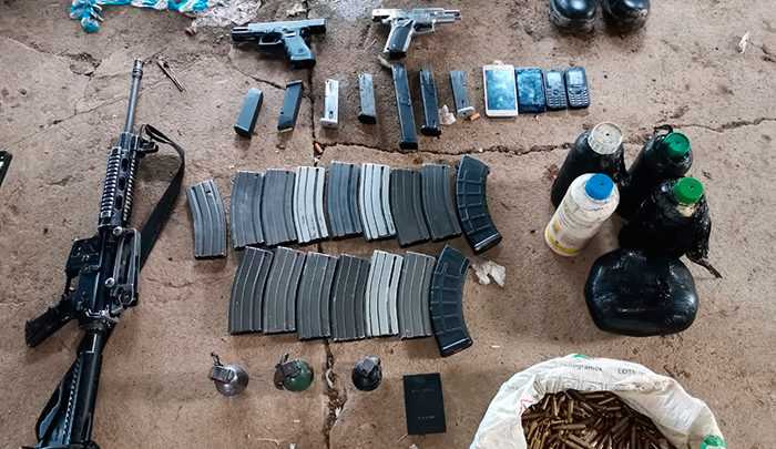 En medio del operativo, fueron incautados un fusil M4, tres armas de fuego, 2 mil cartuchos 5.56 milímetros, ocho proveedores de pistola, 16 proveedores de fusil M4, tres granadas IM 26, cinco celulares, cuatro recipientes de pólvora.