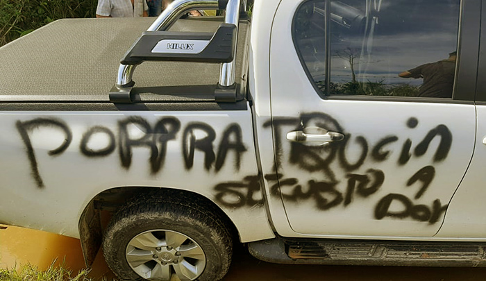 Los agresores dejaron un grafiti en la camioneta de la víctima en la que se alcanza a leer una frase relacionada con la palabra secuestro.