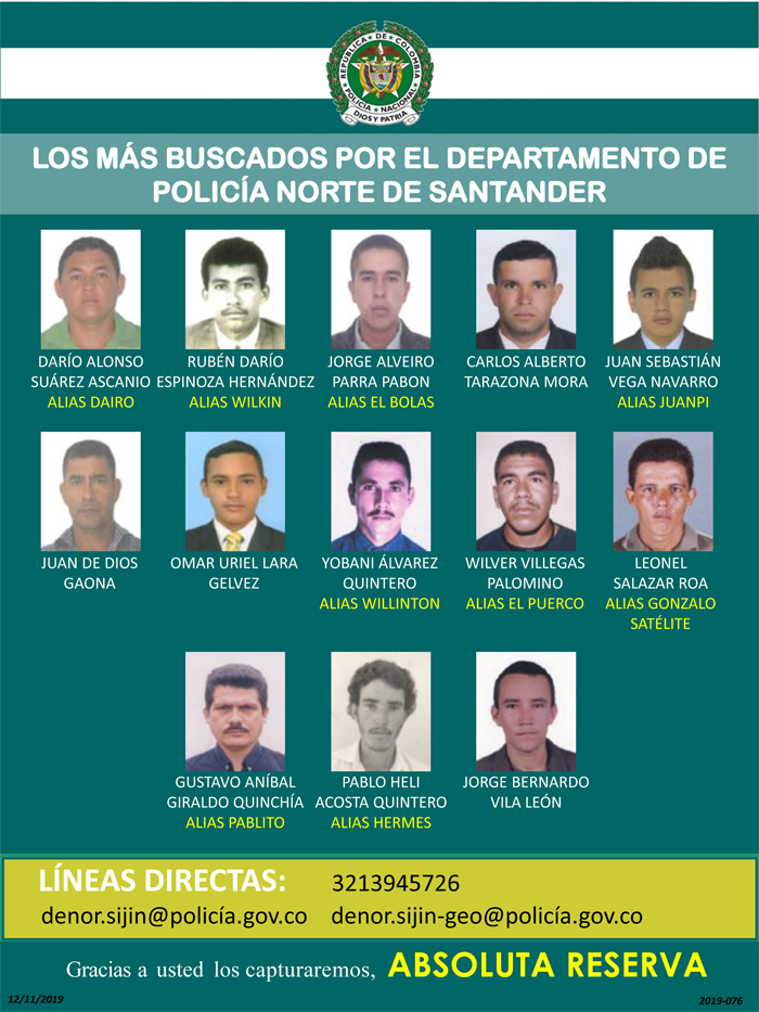 Los buscados por cometer asesinatos en el departamento son: Juan de Dios Gaona, presunto homicida de Jorge Ariel Espinosa el pasado 26 de mayo en La Gabarra (Tibú); Yobani Álvarez Quintero, Willinton, señalado de asesinar a Jhon Elson Vergel y Jesús Elías Guillen, el 11 de enero.