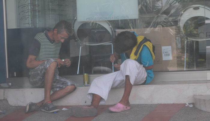 Por la calle 9 entre avenidas 1 y 2, del barrio Latino, justo al frente del parque, hay un pequeño grupo de jóvenes consumiendo drogas. Aunque intentan disimularlo, se puede ver que tienen dos pipas artesanales, donde echan un polvo con algo más y le prenden fuego, saliendo un humo que ellos inhalan.