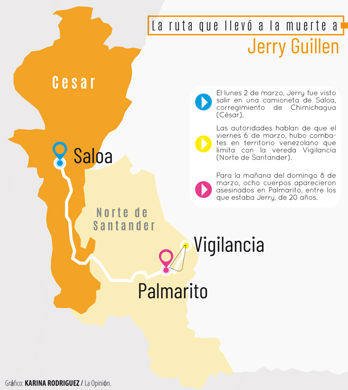 El lunes 9 de marzo, una llamada de la Policía de Chimichagua reportó al consejo comunal de Saloa el hallazgo del cuerpo de Jerry, en Palmarito, a 367 kilómetros de distancia.