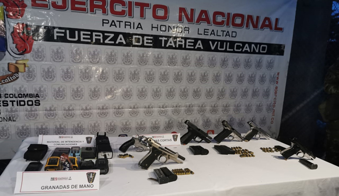 “Fueron incautadas seis armas cortas, ocho proveedores con su respectiva munición, una granada de mano, ocho equipos de comunicación y explosivos, que fue destruido de manera controlada en el lugar”, agregó el general.