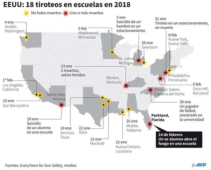 La masacre de 17 personas en una escuela de Florida, de este miércoles, es la balacera 18 en centros educativos en 2018.