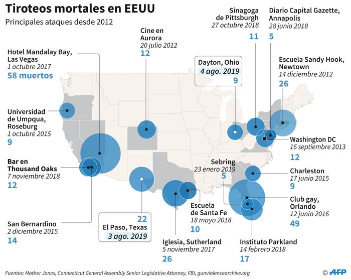 El primero de los tiroteos, registrado el sábado en un centro comercial de El Paso, Texas, dejó 20 muertos y 26 heridos, algunos de ellos críticos, según las autoridades de esta ciudad del sur de Estados Unidos, que detuvieron a un hombre blanco de 21 años e investigan el incidente como posible crimen de odio.