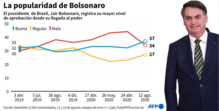 El índice de aprobación del mandatario ultraderechista subió desde junio cinco puntos porcentuales, de 32% a 37%, y el de rechazo cayó diez, de 44% a 34%, precisa la encuesta realizada por el instituto Datafolha el 11 y el 12 de agosto, en base a 2.065 entrevistas telefónicas.