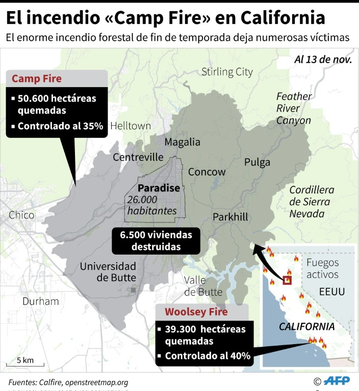 El "Camp Fire", que se desató el jueves, destruyó 7.600 viviendas y 260 comercios en Paradise, arrasó 50.600 hectáreas del condado de Butte y está contenido en 35%, según el departamento de bomberos de California (Cal Fire).