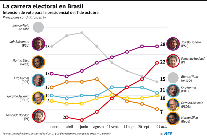 Bolsonaro, un capitán de la reserva del Ejército, nostálgico de la dictadura militar (1964-1985) y quien se caracteriza por sus manifestaciones homofóbicas y racistas, lidera con un 28% las intenciones de voto y es el preferido para ganar en la primera vuelta electoral.