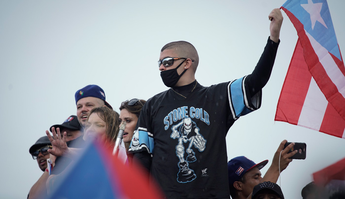 El trapero Bad Bunny, que daba una gira en Europa, decidió poner en pausa su carrera y llegó este lunes a San Juan. "¿No te vas a quitar? íNosotros tampoco! íPuerto Rico se respeta!", escribió en Twitter.
