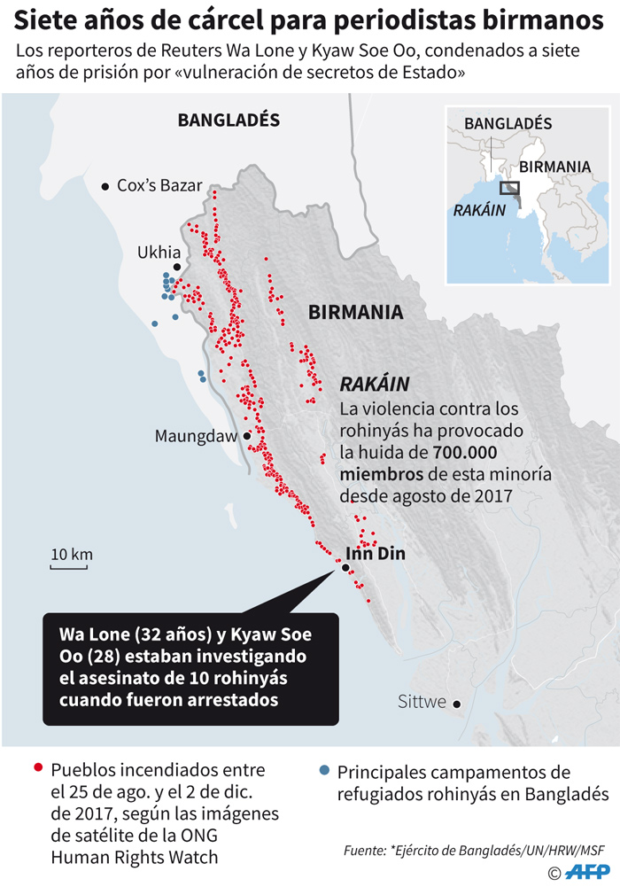 Reporteros Sin Fronteras (RSF) denunció como una "farsa" la sentencia condenatoria contra dos periodistas birmanos de la agencia Reuters condenados en su país en relación con la investigación que llevaron a cabo sobre una matanza de miembros de la minoría musulmana de los rohinyás.