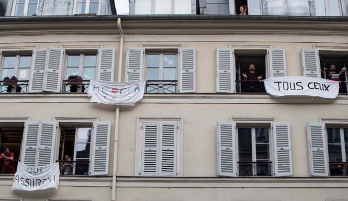 (Los habitantes aplauden para mostrar su apoyo a los empleados de la salud, en París.)