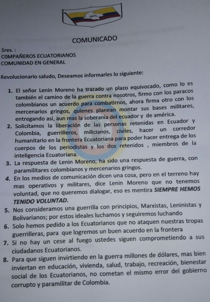 “Si no hay un cese el fuego ustedes siguen comprometiendo a sus ciudadanos ecuatorianos… Para qué siguen invirtiendo en la guerra millones de dólares; más bien inviertan en educación, salud, trabajo, recreación y en bienestar social del los ecuatorianos. No cometan el mismo error del gobierno corrupto y paramilitar de #Colombia”, dice el comunicado.