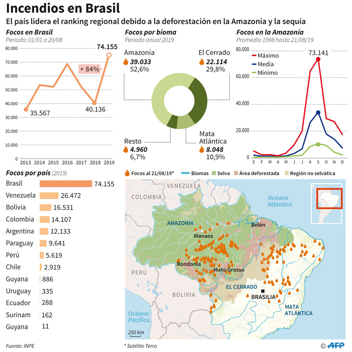 Los focos de incendios forestales en Brasil han aumentado este año 83% en comparación con 2018, debido a las quemas de la región amazónica potenciadas por la temporada seca, con espesas nubes de humo que en los últimos días cubrieron varias ciudades.