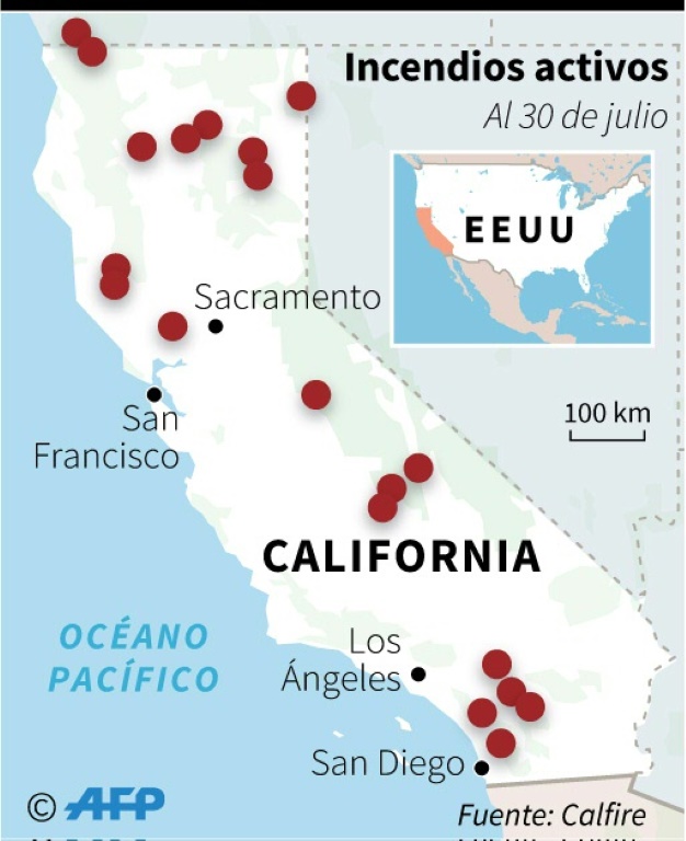 Cerca de 12.000 bomberos luchaban este lunes contra las llamas descontroladas de 17 grandes incendios que avanzan alimentados por la severa sequía en California, donde ya han muerto al menos siete personas y decenas de miles de hectáreas han sido calcinadas.