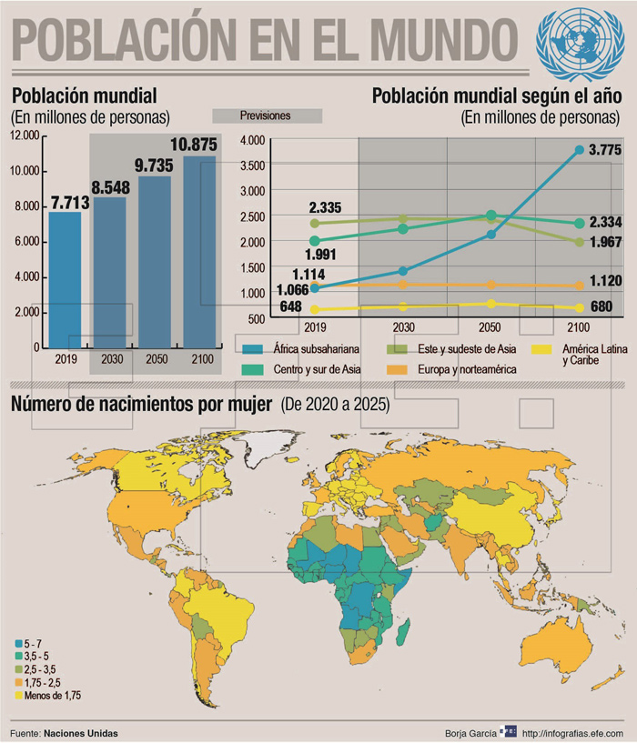 En el anterior estudio sobre el crecimiento poblacional, publicado en 2017, la ONU había avanzado que en 2050 casi 9.800 millones de personas poblarían la tierra y que en 2100 serían 11.200 millones.