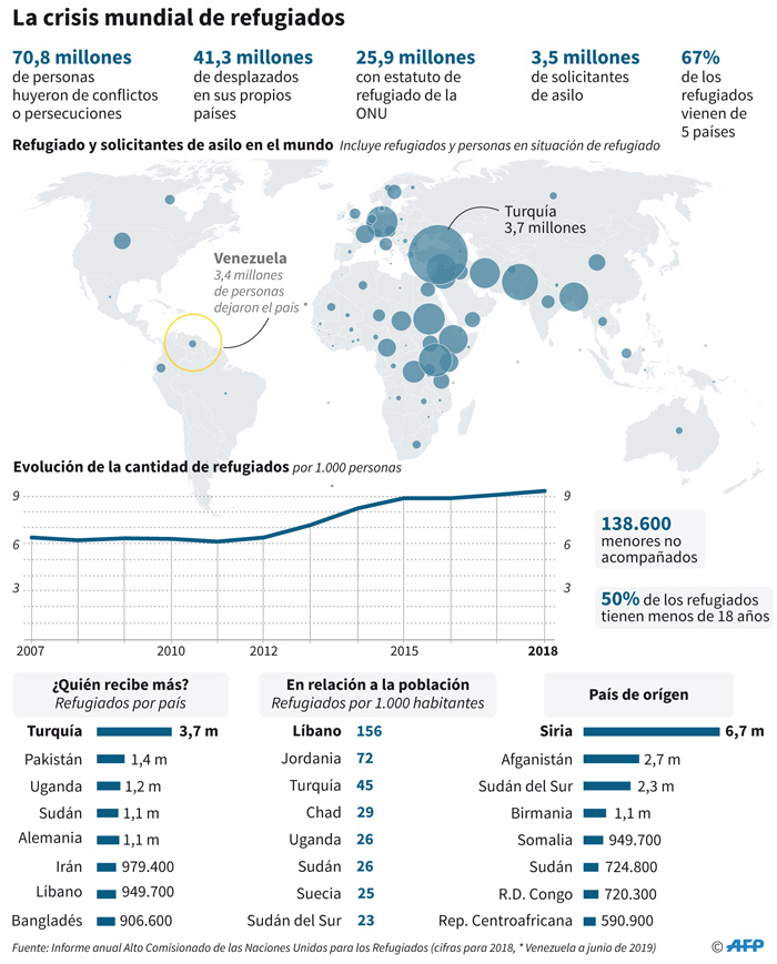 A fines de 2018 había 70,8 millones de personas desplazadas en el mundo debido a guerras o persecuciones, un récord que no refleja la amplitud del éxodo venezolano, ya que solo una minoría pide asilo, anunció la ONU el miércoles.