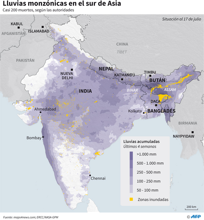 En India, casi un centenar de personas murieron a causa de las inundaciones y derrumbes de edificios en distintas partes del norte del país. Los estados de Bihar y Assam sufrieron más de la mitad de estas muertes, provocando además decenas de miles de desplazados.