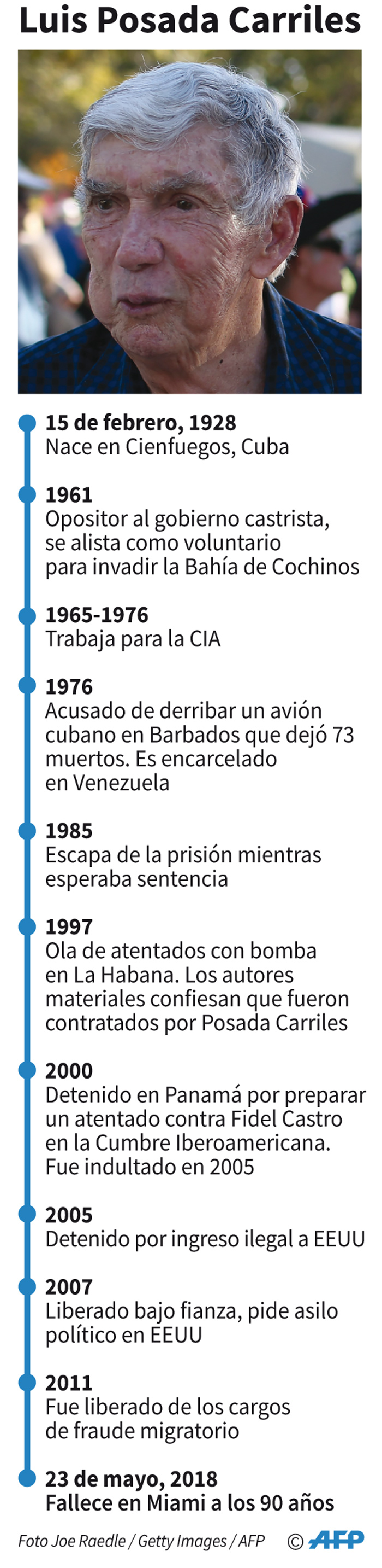 El connotado anticastrista Luis Posada Carriles, quien trabajó para la CIA y era señalado por La Habana como responsable del atentado contra un avión cubano en 1976, falleció este miércoles a los 90 años, informó su abogado.