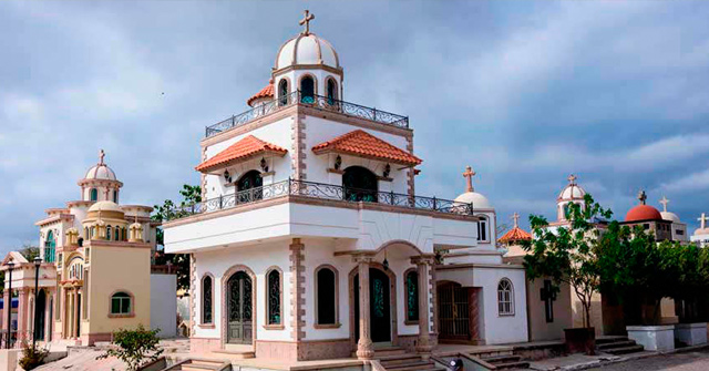 Vista del cementerio Jardines del Humaya, conocido por sus mausoleos que cuentan con lujos y servicios como aire acondicionado y vidrios a prueba de balas. Está ubicado en Culiacán, estado de Sinaloa, México.
