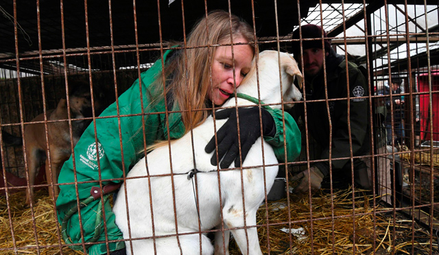 Labradores, beagles y otros perros ladran cuando sus salvadores los sacan de las jaulas de una granja de Corea del Sur. Serán enviados a sus familias de acogida occidentales para evitarles acabar en un plato. Ser productor de carne canina tiene las horas contadas.