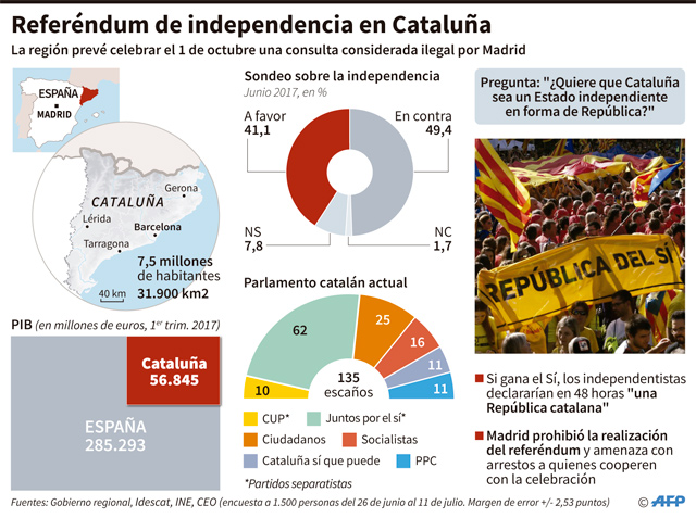 En las elecciones regionales de 2015, los independentistas obtuvieron el 47,6% de los votos y los defensores de seguir en España el 51,28%. Pero el 70% de los catalanes está a favor de zanjar la cuestión a través de un referéndum legal, según las encuestas.