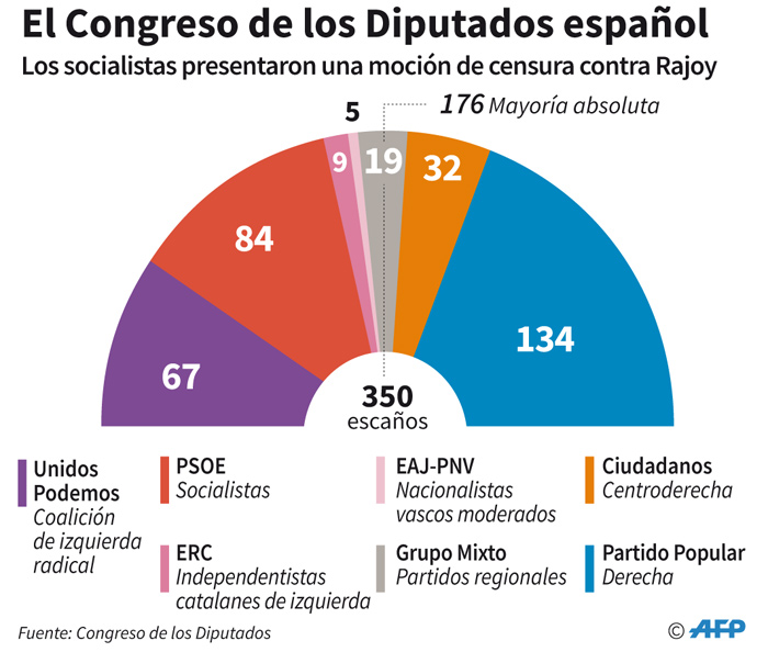 En la tarde de este jueves se confirmó que una mayoría de diputados de la cámara baja -180 de un total de 350, pertenecientes a ocho fuerzas políticas- apoya la moción de censura presentada por el líder socialista Pedro Sánchez, quien está llamado a suceder a Rajoy, en el poder desde fines de 2011.